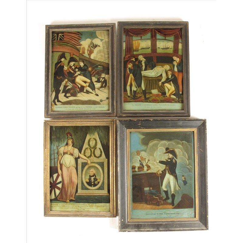 Four early 19th century Nelson commemorative reverse glass pictures, 'ADMIRAL LORD NELSON giving his last ORDERS to CAP. HARDY of the Victory after he was mortally Wounded, Oct. 21. 1805', 13¾ x 9½in (34.7 x 24.1cm); 'The DEATH of ADMIRAL LORD NELSON, Oct. 21. 1805. He Died for his Country.' both published November 21st 1805 by I. Hinton, 44, Well St. Oxford St. London; 'Brittannia lamenting the death of Admiral Lord Nelson, Who after a Series of transcendant and heroic Virtues, fell gloriously in his 121st Engagement in the Moment of a Brilliant & Decisive Victory, obtained over the Combined Fleets of France and Spain on the 21st Octr 1805.' published December 5th 1805 by W. B. Walker, Fox & Knot Cot. Snow Hill, London' and 'ADMIRAL LORD COLLINGWOOD' published November 28th 1805 by I. Hinton, 44 Wells Str. Oxford Str. London. (4)