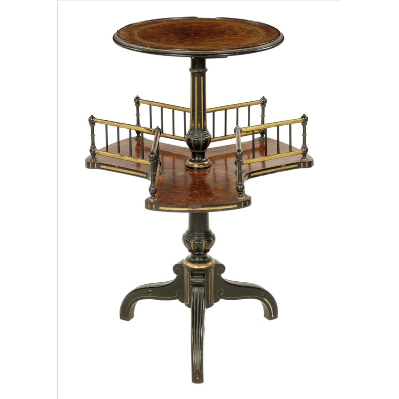 A late Victorian ebonised parcel gilt and amboyna book table, with a revolving centre, 29½in (75cm) high, 21in (53.3cm) wide.