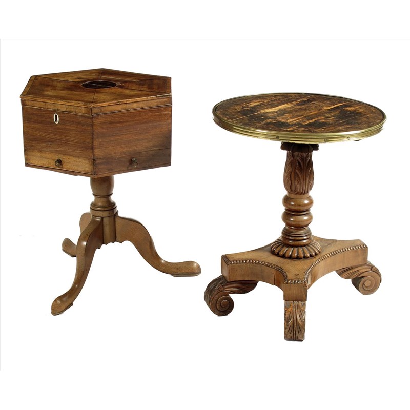 A mahogany occasional table, the replaced pine top with a penwork still life, on a George IV base, 19¼in (49cm) high, 16in (40.6cm) wide and an hexagonal pedestal workbox with a hinged lid and frieze drawer, 21in (53.3cm) high. (2)