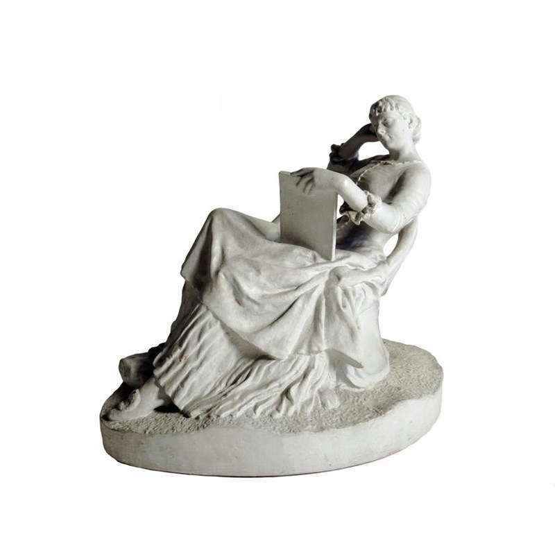 A late Victorian painted terracotta group of a lady seated on an armchair reading