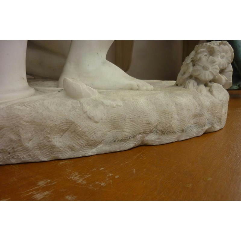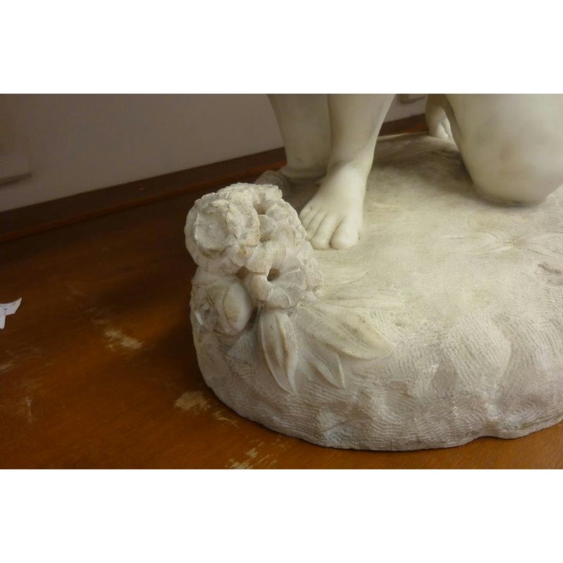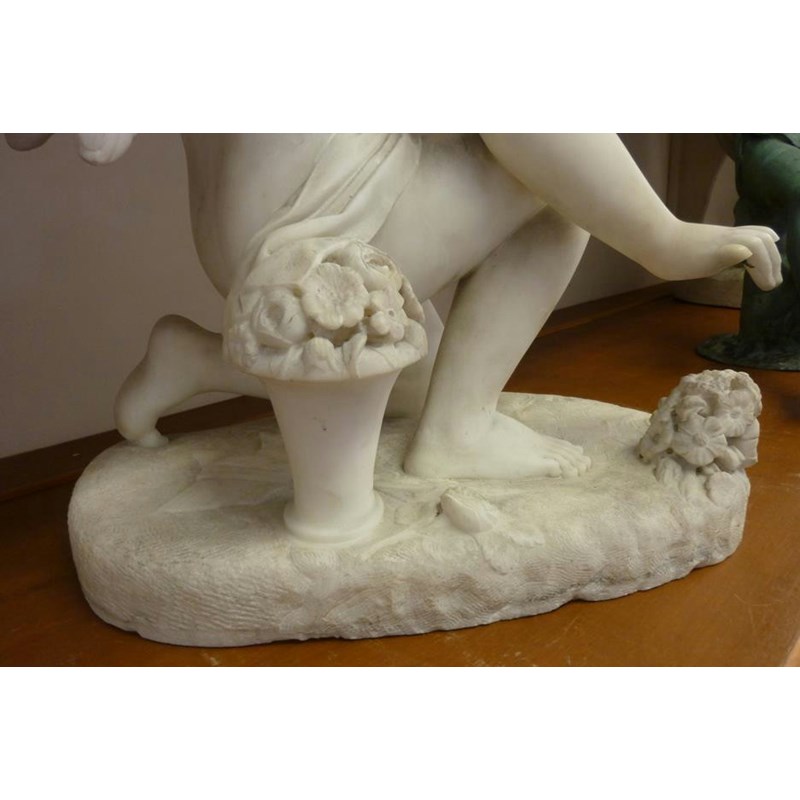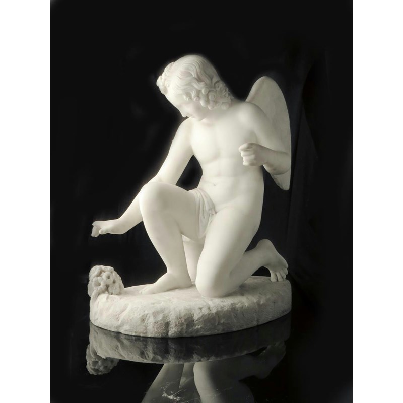 A 19th century carved white marble model of Cupid, kneeling with his right hand outstretched towards some flowers, 51cm high, 42.5cm wide, 27cm deep.