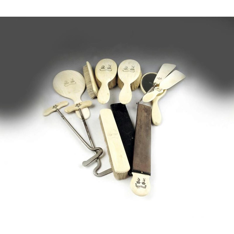 λ Eleven ivory gentleman's toilet items, two hand mirrors, four brushes, a pair of boot-pulls, a button hook, a shoe horn and a leather cased razor hone, ten with the Smyth double crest of a unicorn and stag, ducal coronet and the motto 'EXALTABIT HONORE', late 19th century, 26.7cm long, max. (11)