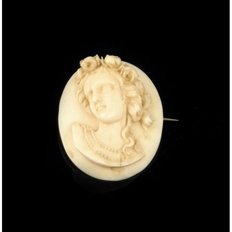 λ A Victorian carved ivory brooch, of a bust of a young lady with flowers in her hair, 4.8cm high.