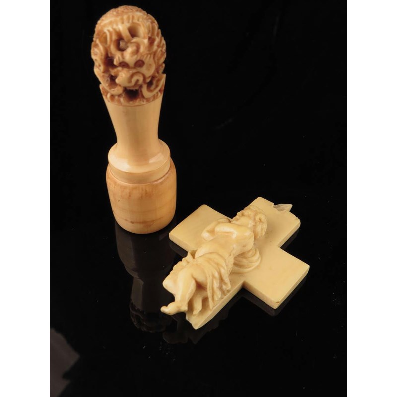 λ A late 19th century Chinese carved ivory seal and stopper, carved with a dragon, 6.5cm high, together with a European carved ivory section of a cross with a sleeping cherub. (2)