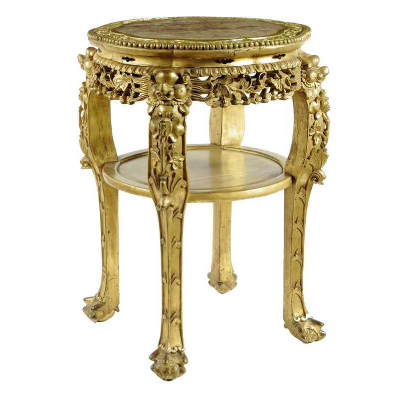 A Chinese giltwood jardinière stand, the lobed top inset with marble with a leaf carved surround and a leaf and berry pierced frieze, late 19th century, 81.4cm high, 47.5cm wide.
