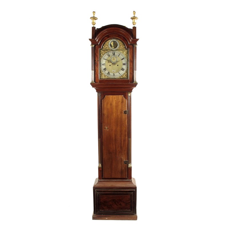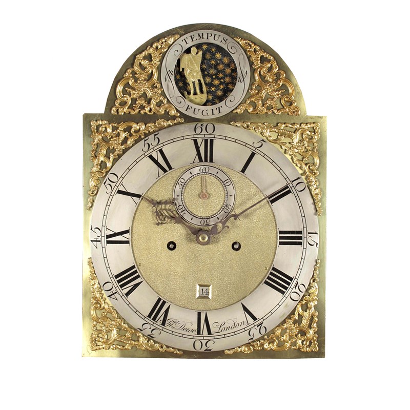 An 8 day mahogany longcase clock with automaton, the 12 inch brass dial singed on the silvered chapter ring Jno Dewe, London, subsidiary seconds and date aperture in the matted centre, the arch containing and automon of Old Father Time, the 4 pillar movement in a break arch case, 7ft 5in (226cm) high.