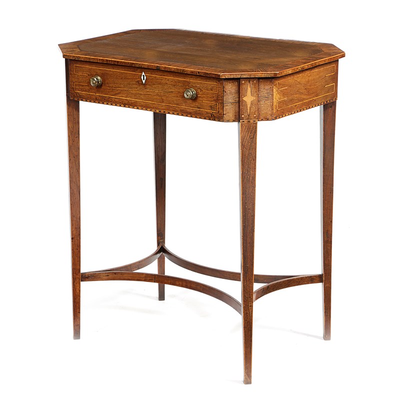 inlaid with stringing and lozenge parquetry banding, the crossbanded top above a frieze drawer, with a bone/ivory escutcheon