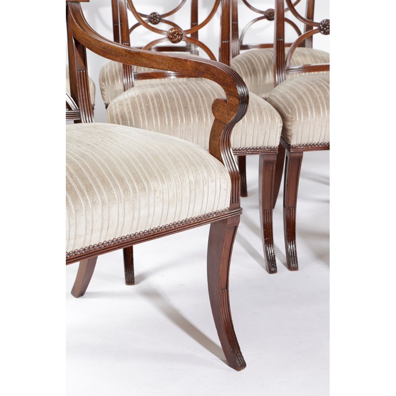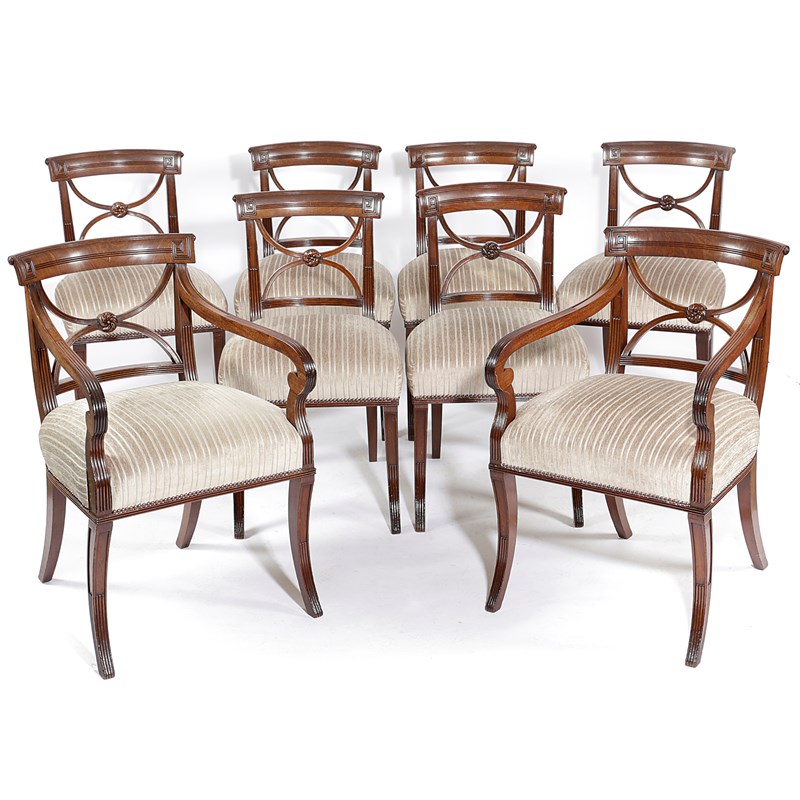the bar top rail with Greek key style carving, above an 'X' splat with a central floral rondel above stuffed over seats and sabre legs with reeded decoration, comprising: two carvers and six side chairs, the front rails with an applied Ronald Phillips label, reference number '12160' (8)