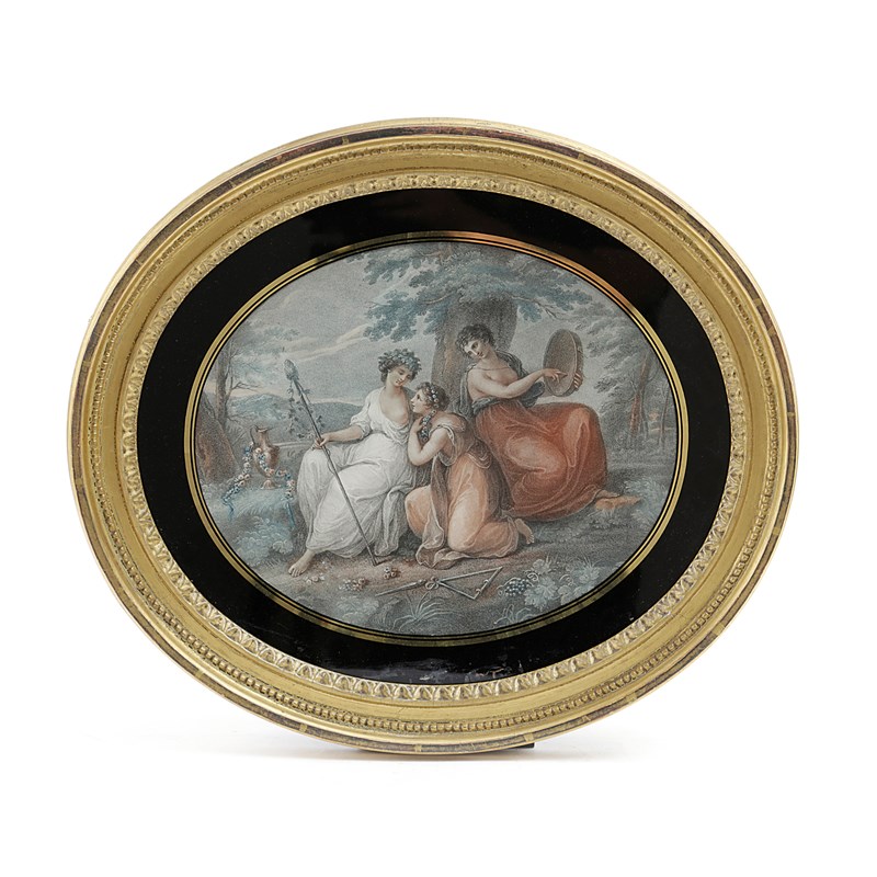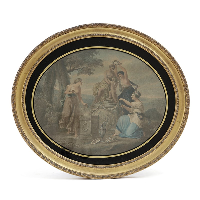 one titled 'Bacchanalians' after Angelica Kauffman, the other with a classical scene of muses and a cherub, both in gilt frames (2)
