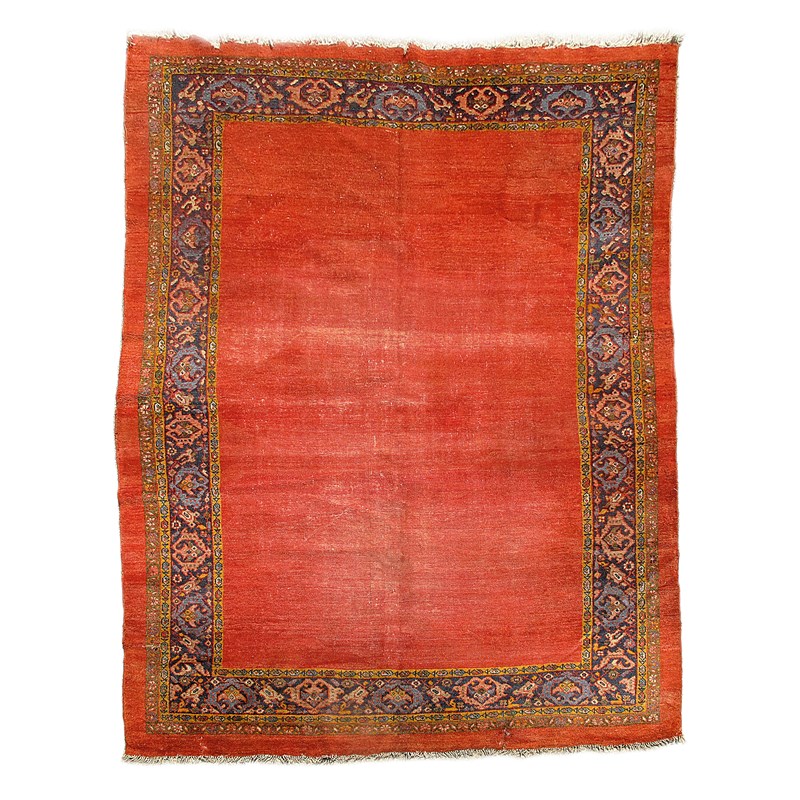 the plain tomato red field enclosed by indigo borders of turtle motifs, flanked by carnation and boteh guard stripes