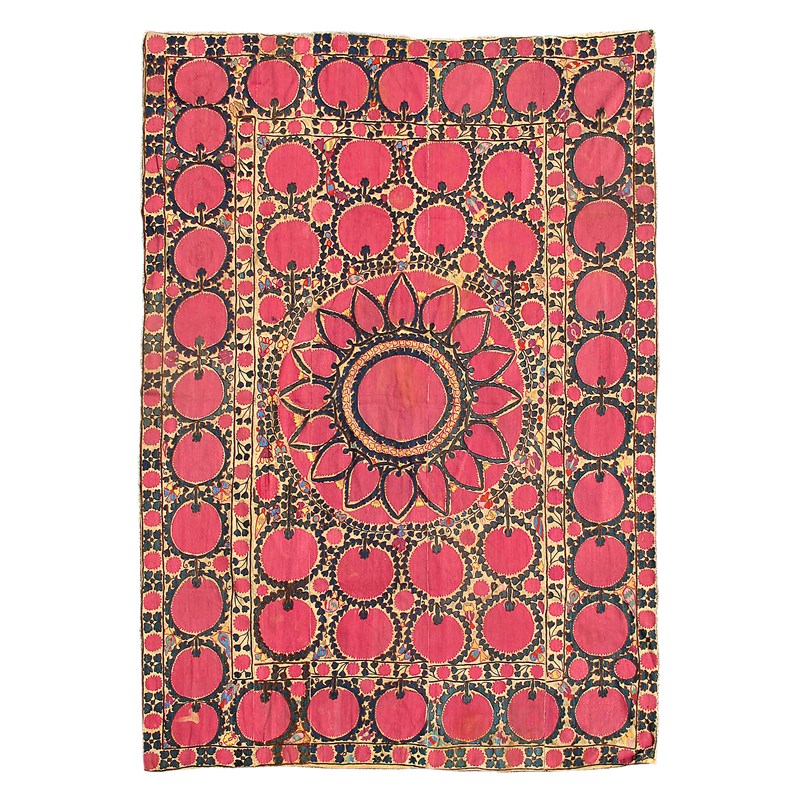 woven in sections on a linen base, the field centred by a large flowerhead rondel surrounded by smaller rondels and similar borders, with inner meandering vine guard stripes