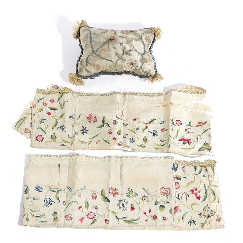 worked in colours with scrolling, floral foliage on a cream ground, together with two cream silk panels, 17th or 18th century, worked in colours with scrolling flowers and foliage (3)