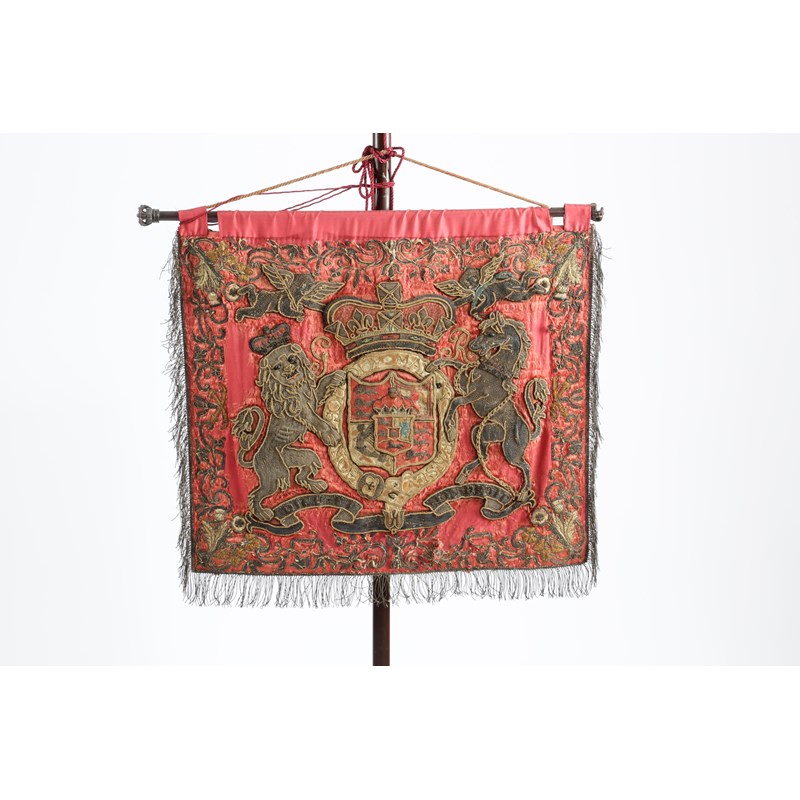 A LATE GEORGE III RED SILK DAMASK AND WIREWORK PENNANT OR BANNER