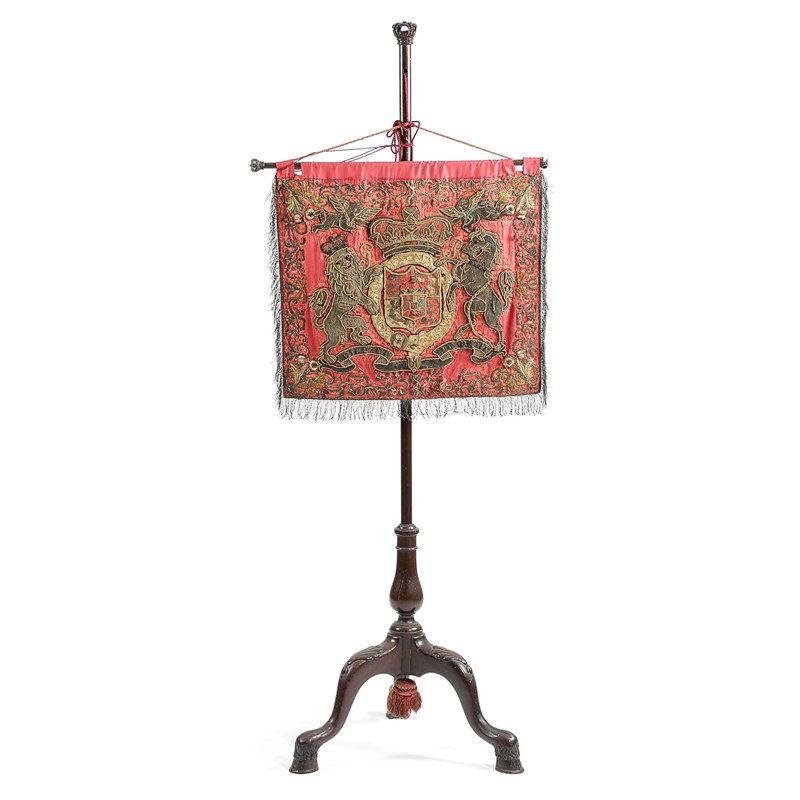with an embroidered border and applique central Royal Coat of Arms beneath a 'GR' monogram, on a mahogany tripod stand with a crown finial and shell carved knees