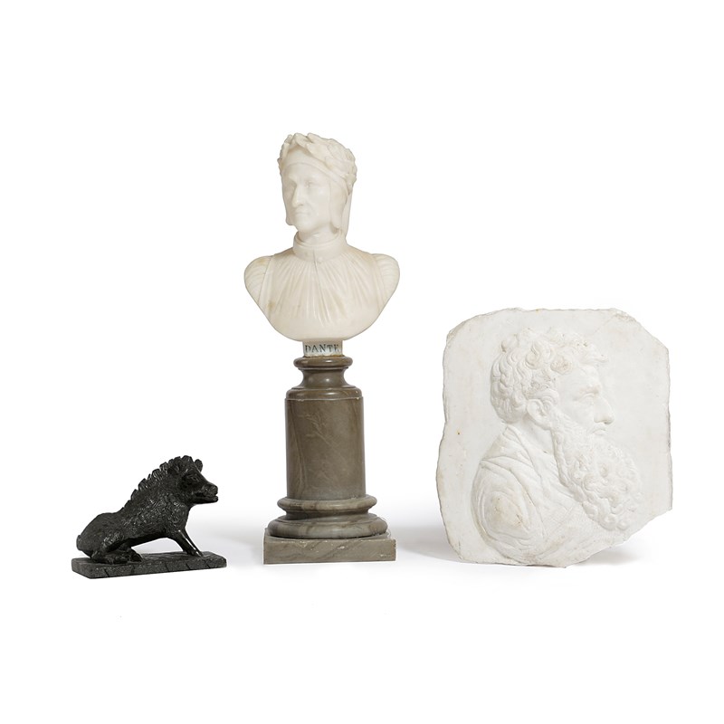 on a grey marble plinth, together with an alabaster plaque carved in relief with a profile portrait of a bearded gentleman and a carved serpentine figure of a 'Porcellino' or the Uffizi wild boar (3)