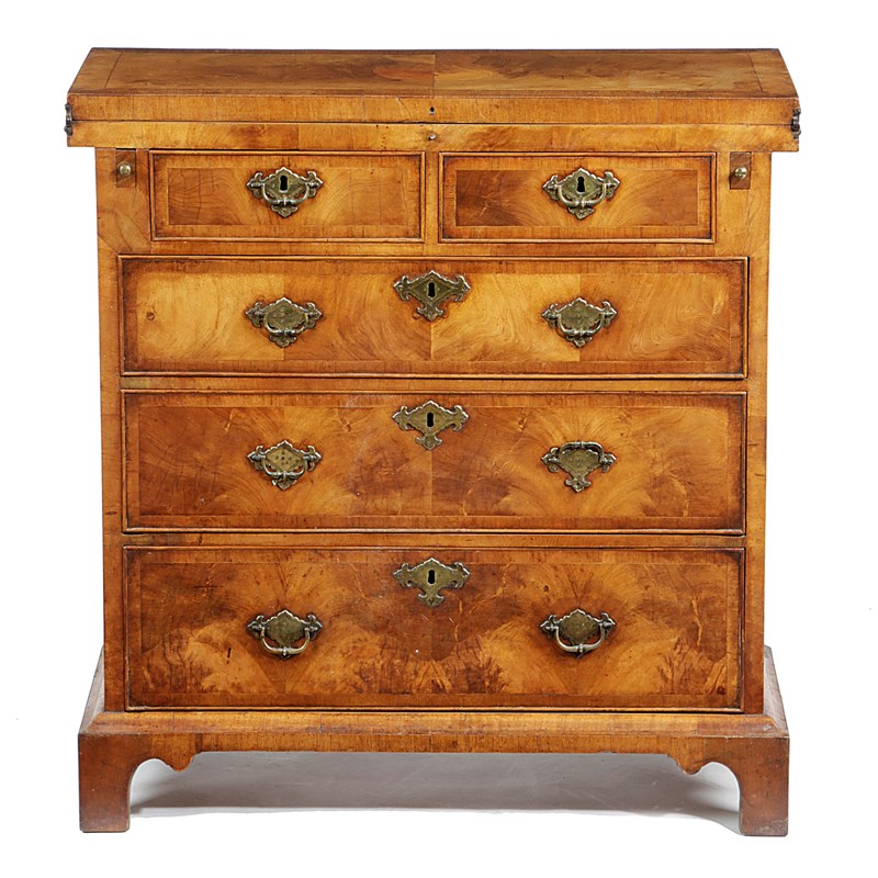 crossbanded and inlaid with stringing, the quarter veneered fold-over top above two short and three long drawers, on bracket feet
