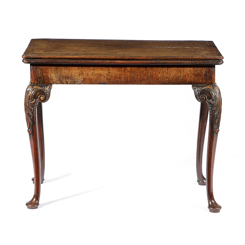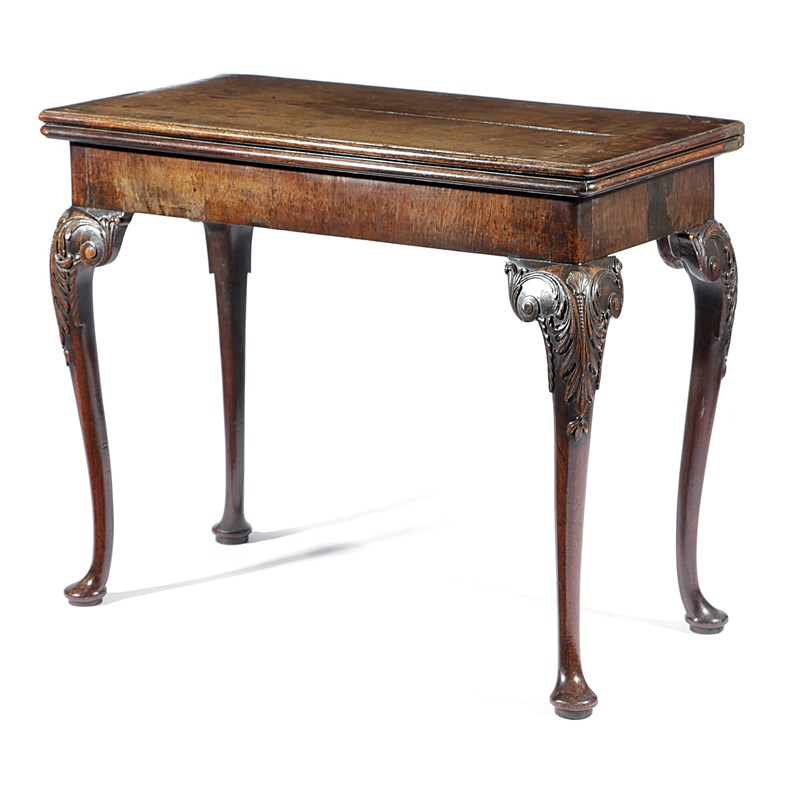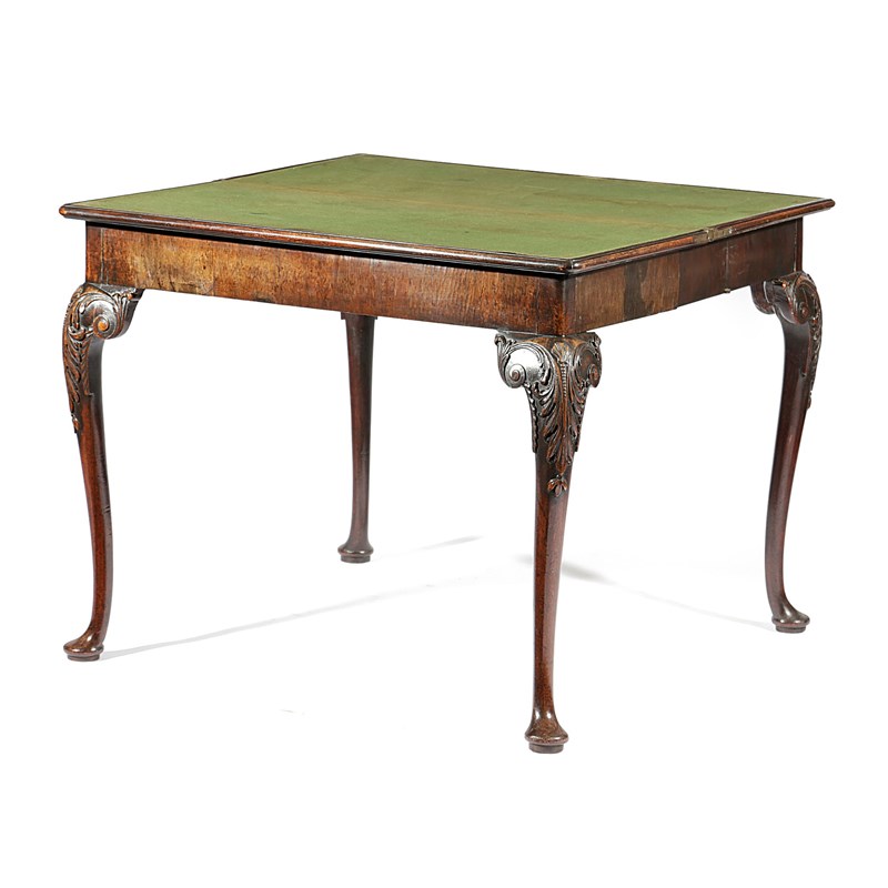 the fold-over top revealing a baize lined playing surface, on shell, leaf and scroll carved cabriole legs and pad feet