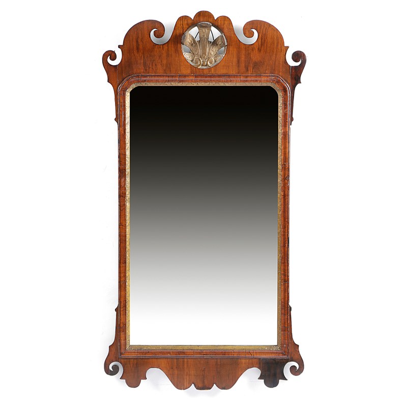 A GEORGE II WALNUT AND PARCEL GILT FRET-FRAME MIRROR