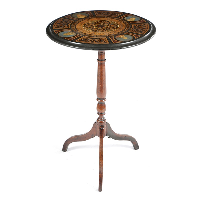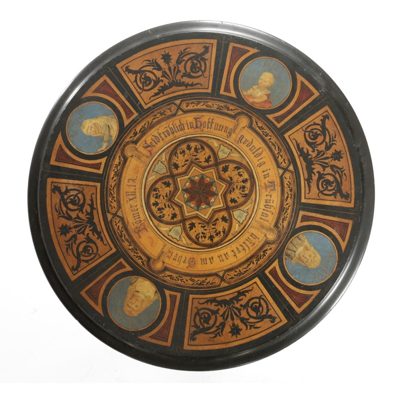 the circular ebonised and painted top decorated with four portrait miniatures of children, each named and with panels of scrolling leaves, with a German inscription and the date '1879', on an associated mahogany base