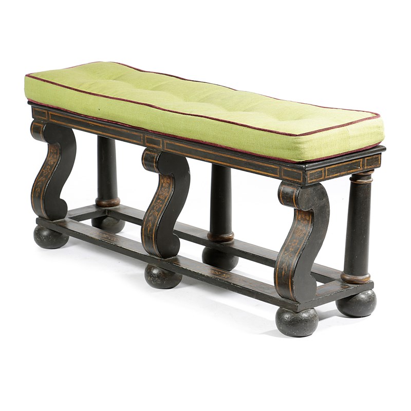 with parcel gilt decoration of leaves and flowers, on scroll front supports and bun feet, with a squab cushion (2)