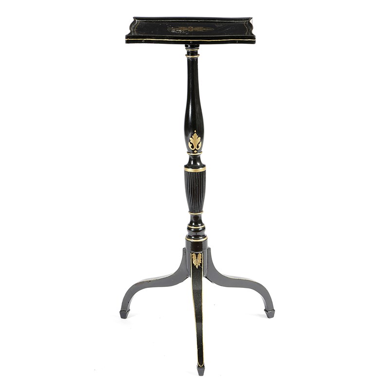 the shaped top painted with a leaf patera, on a turned baluster and ribbed stem, on a tripod base
