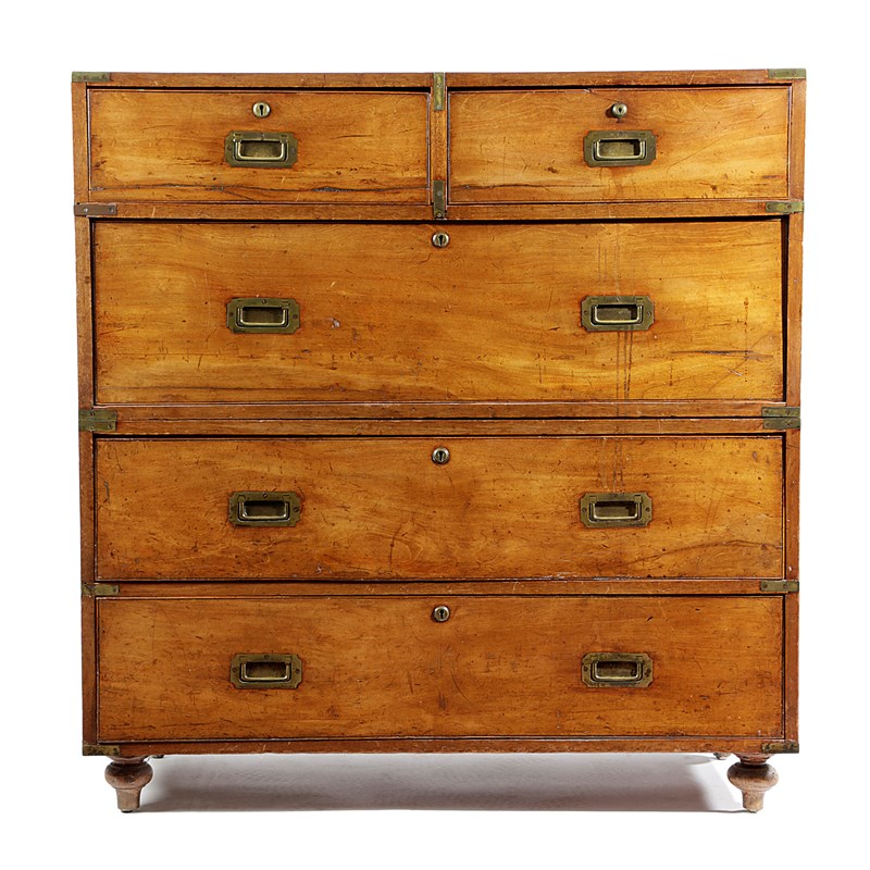 in two halves, with brass mounts, with two short and three long drawers with Bramah locks, with sunken military style handles and on bun feet