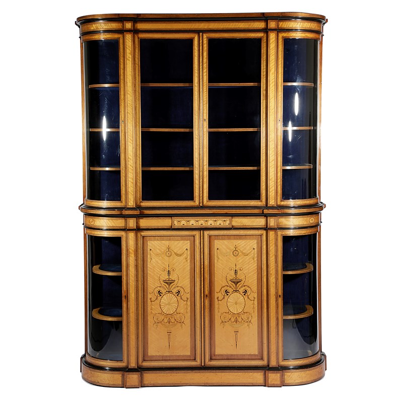 in two parts, inlaid with urns, swags and paterae, with crossbanding and stringing, the upper section with a pair of glazed doors enclosing three plush lined shelves, flanked by further doors, with a conforming base section, the panelled doors enclosing a shelf