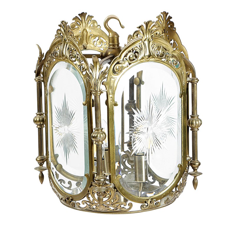 with four bevelled and etched glass panels and with pierced leaf and scroll decoration, with a later three-light fitting