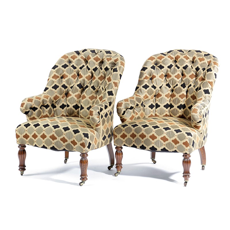 later button upholstered, on ribbed baluster front legs and brass castors (2)