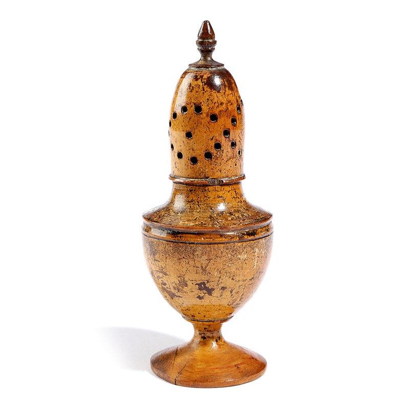 A GEORGE III TREEN PAINTED SYCAMORE CASTER OR MUFFINEER