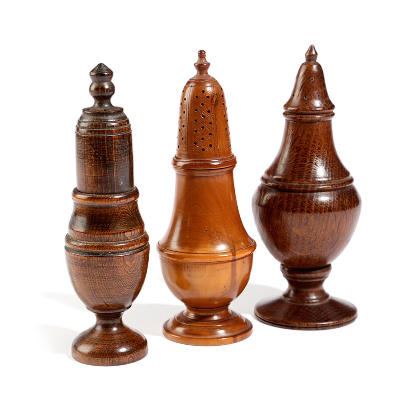 one possibly yew, of baluster form and with a pierced cover, together with an oak example with a screw-off foot, the third of bullet shape (3)
