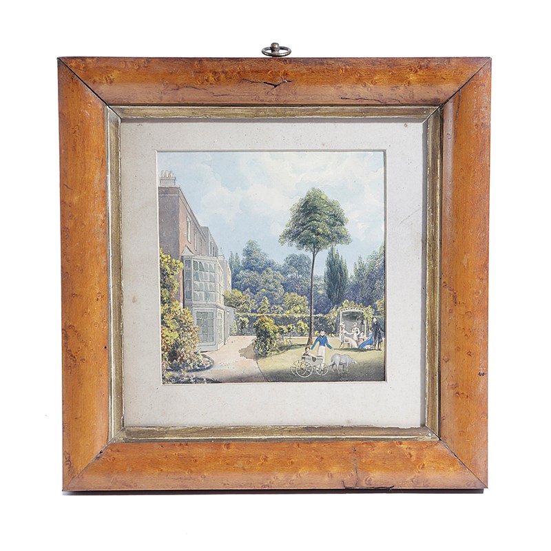 depicting figures taking tea in the garden of a Georgian house, in a glazed bird's eye maple frame