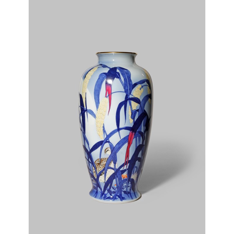 The baluster-shaped body decorated with a continuous design of a small quail hiding amongst sprays of millet and daisies, with a gilded rim and signed Fukagawa sei with the Fujiyama mark, 38cm.