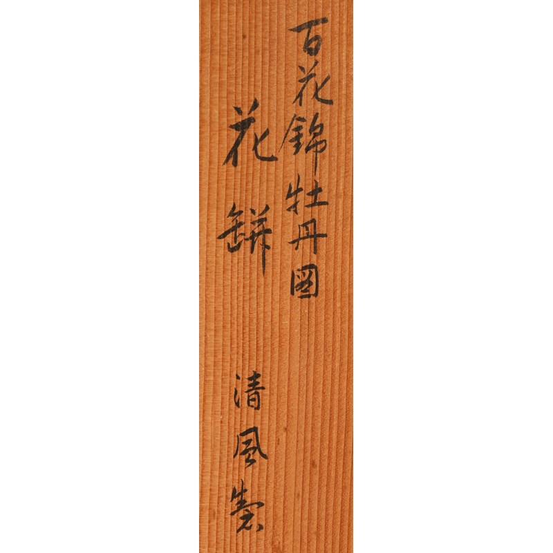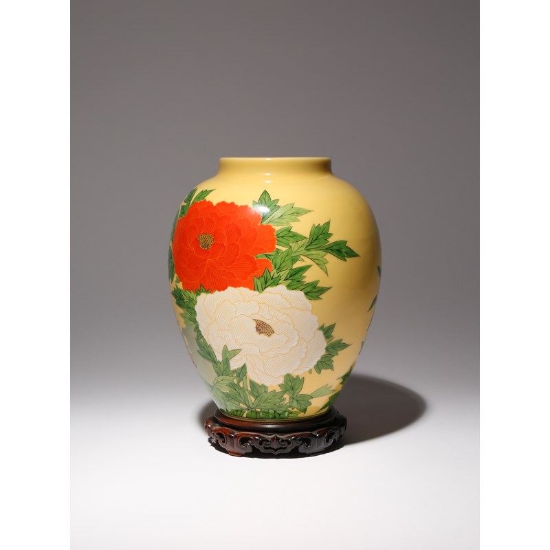 The ovoid body decorated with a continuous design of butterflies fluttering amongst large peonies, with leafy branches depicted in various shades of green on a deep honey-yellow ground, with details incised and others rendered in low relief, the base signed Seifu, raised on a wood stand and with two tomobako wooden boxes, the inner box inscribed Hyakka nishiki botan no zu kabin (flower vase with hundred colourful peonies) with seal, the lid signed Seifu tsukuru (made by Seifu), the outer box with similar inscriptions, 26cm. (7)