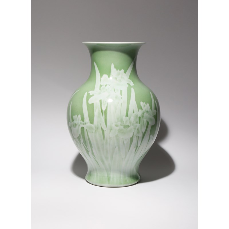 The tall baluster body painted in resist decoration on a diaphanous green-glazed ground with blossoming irises, the inside of the rim left white, the base signed Makuzu Kozan sei in a rectangular cartouche, 43cm.
