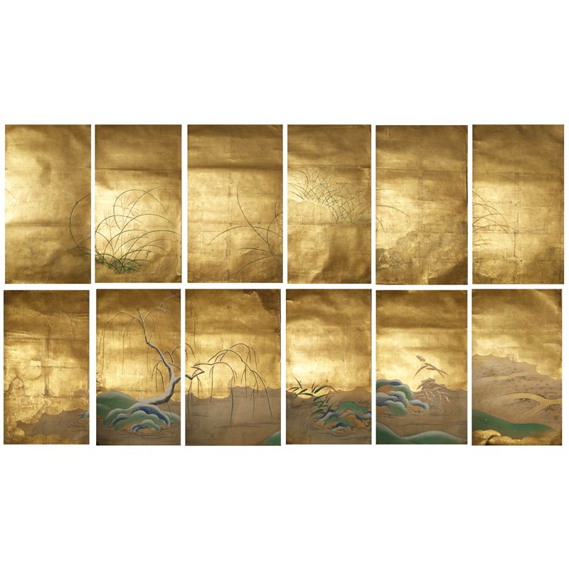 Originally from a paper screen, in ink, colour and gold leaf on paper, six depicting tall grasses and the other six with a tree by a river in a snowy landscape, both sets on a gold ground, all approx. 88.5cm x 47cm. (12)