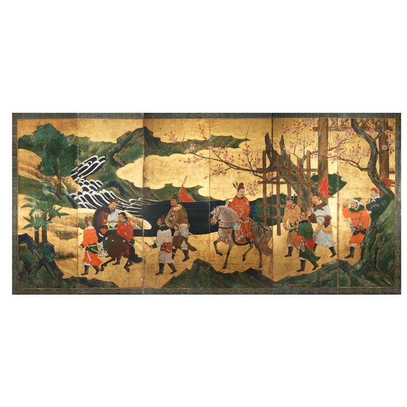 See the Metropolitan Museum of Art, New York, access. nos.2006.42.1,2 for a comparable six-fold screen, one of a pair attributed to Kano Takanobu (1571-1618) and painted with a similar procession of the Chinese Emperor Wen with a retinue of ten attendants.