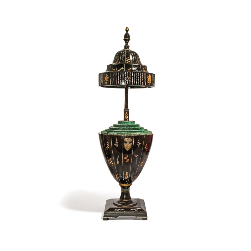 Formed as an urn with a rising cover revealing tiered compartments for knives, decorated to the exterior with vertical panels in mother of pearl and gold, depicting ho-ho birds, urns and flower sprays, the square plinth raised on four bracket feet, 76cm.