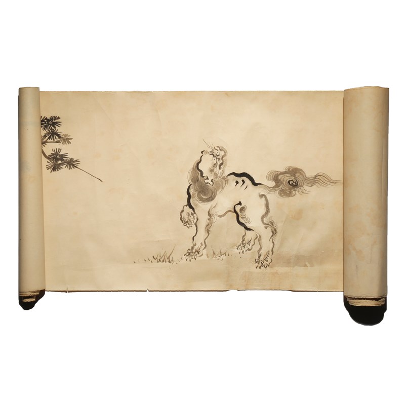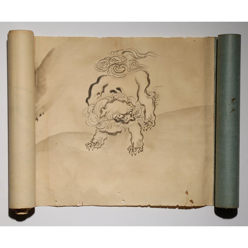 In ink on paper, painted with nine shishi frolicking in a river landscape, the lion dogs depicted with curling manes, the end of the scroll inscribed Hogen Sukekiyo ga for Kano Kuninobu (1787-1840), approx. 28cm x 223cm.