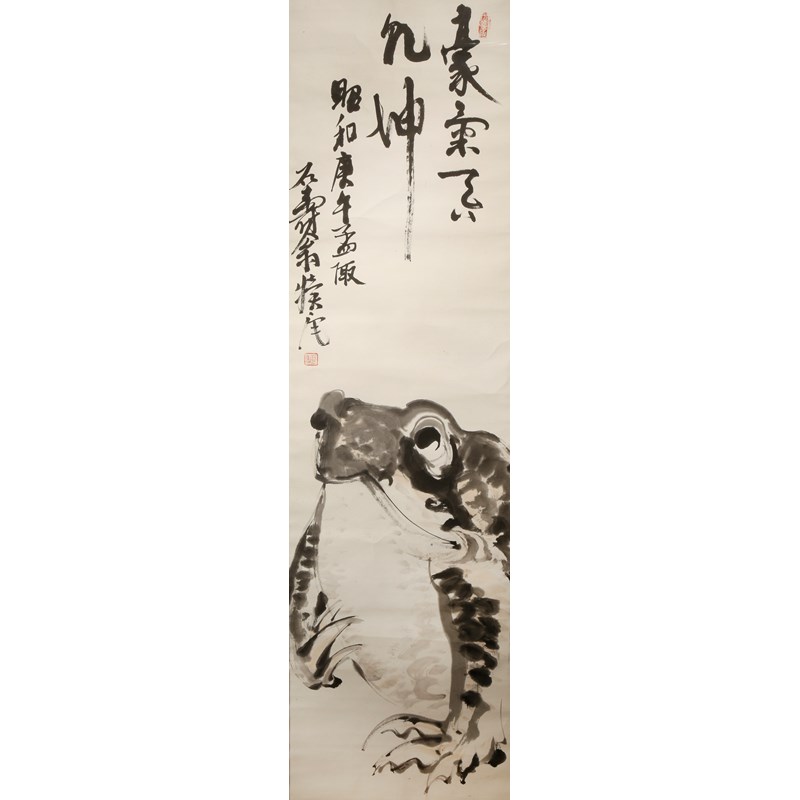 Painted in ink and colour on paper, depicting a large disgruntled-looking toad underneath lines of calligraphy, with two red seal marks, in a modern frame and glazed, 109cm x 31cm.