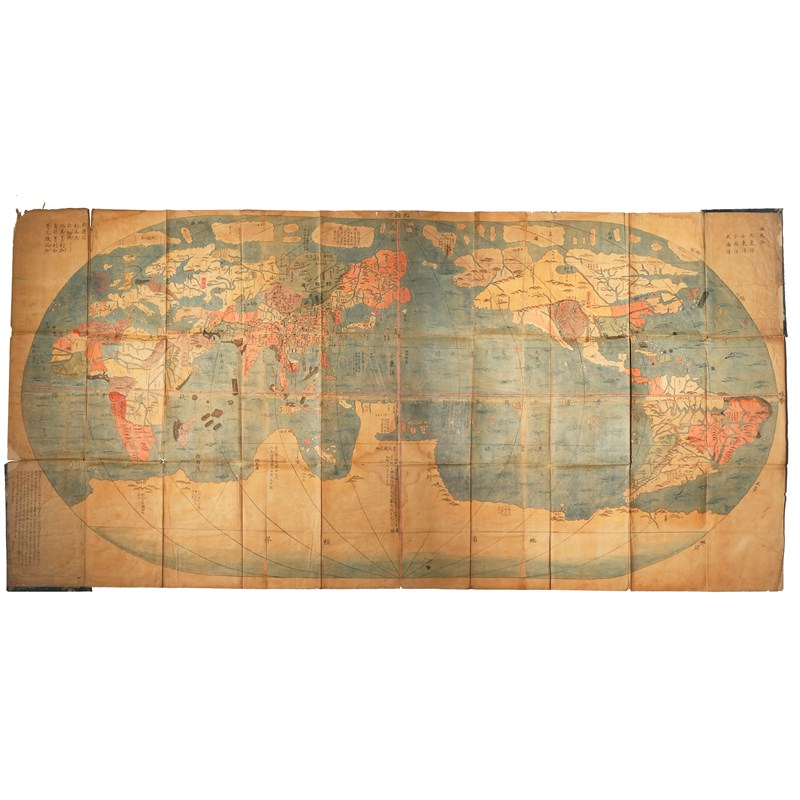 Entitled Yochi zu or Yochi no zu (Picture of the World), depicting Europe, Asia and Africa on the left-hand side and the Americas to the right, with hand-coloured details later added in watercolour, together with a modern protective cover, 73.5cm x 147cm. (2)