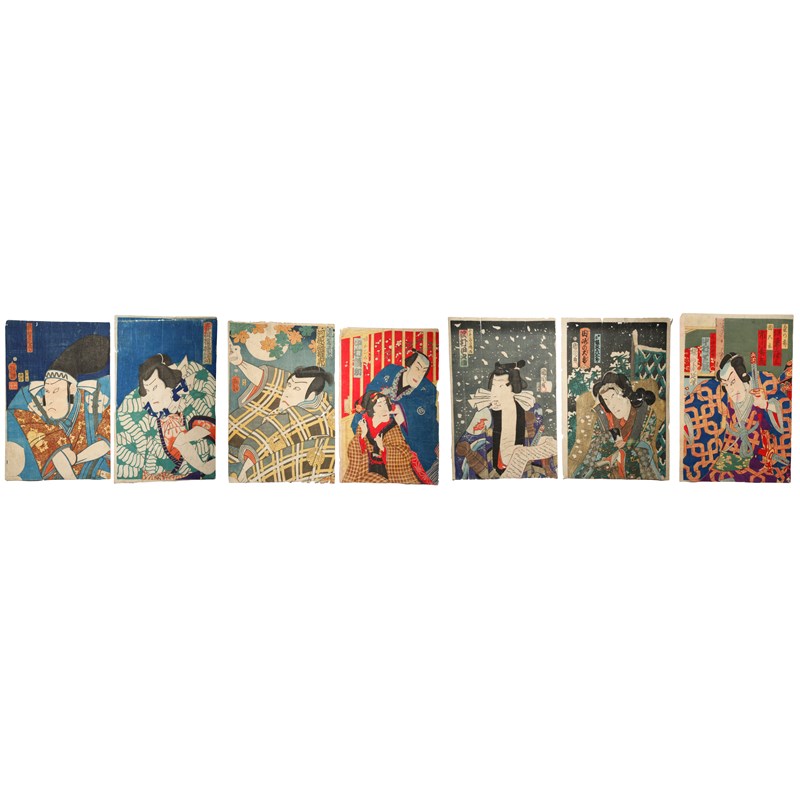 Including beauties in gardens, portraits of famous actors and other figures engaged in daily life, some by Tsukioka Yoshitoshi (1839-1892), Toyohara Kunichika (1835-1900) and Chikanobu Yoshu (1838-1912). (7)