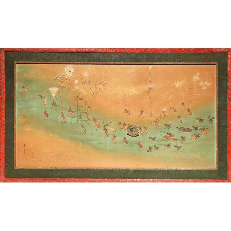 Depicting a procession of forty insects including grasshoppers, praying mantises, ants and other bugs, in relief and made up of paper and folded fabric on a painted ground sprinkled with gold, the insects recreating a daimyo procession when feudal lords and attendants would travel throughout Japan, the noblemen and their retinue alternately living in their domains and in Edo (Tokyo), some carrying large lilies, daisies and other flowers as banners, others with food rations, one locust riding a large cicada as a mount, the beetle daimyo carried in a kago litter by four others, a two character signature to one corner and a red seal mark, in its original frame embellished with green fabric and floral designs in red lacquer, 55cm x 95.5cm.