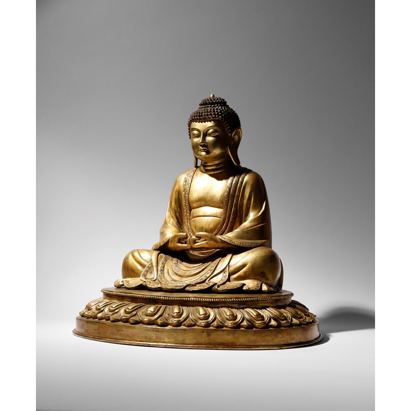 His eyes lowered and with a serene expression, his hair cast in tight curls, seated in dhyanasana with his hands held before him in the mida no join position, the hem of his robes decorated with bands of foliate scrolls, raised on a large lotus throne, 45cm. (2)
