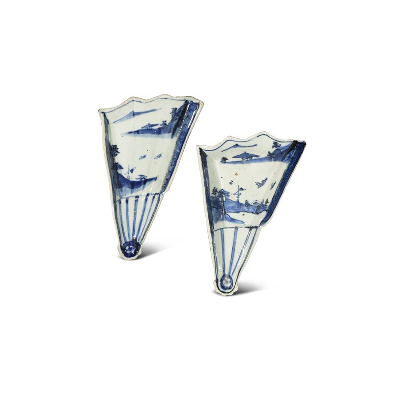 Shaped as fans, both decorated with a mountainous river landscape, with fishing boats on the water and a pavilion in the distance, one with two figures in the foreground playing weiqi, both 22cm approx. (2)