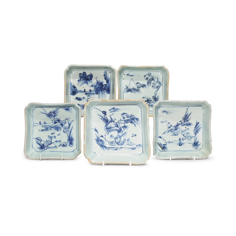 Of square shape, with tall rims and raised on four short feet, the wells decorated with figures in mountainous river landscapes, the sides with scrolling tendrils and stylised flowerheads, each 14cm x 14cm approx. (5)