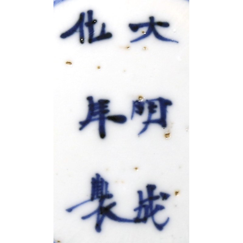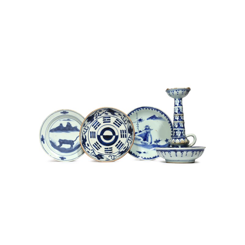 One decorated with a tiger in a mountainous river landscape, with four butterflies to the rim; another with a horse rider and his attendant approaching a fortified city; the third with the yin yang symbol surrounded by the eight trigrams, with cranes in flight to the cavetto, a six character Chenghua mark to the base; together with a 19th c. nightlight with a tall neck rising above a saucer decorated with flowerheads and clouds, 19cm max. (4)