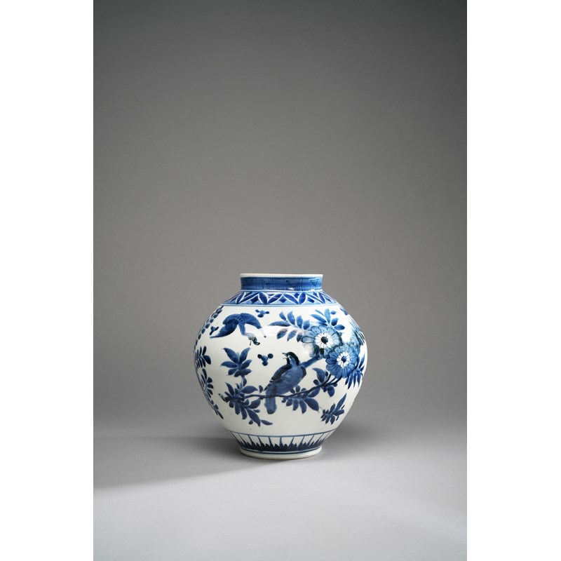 The ovoid body decorated with birds amongst flowering branches, with butterflies fluttering above, in between borders of lappets and key fret to the neck and above the foot, 23.5cm.