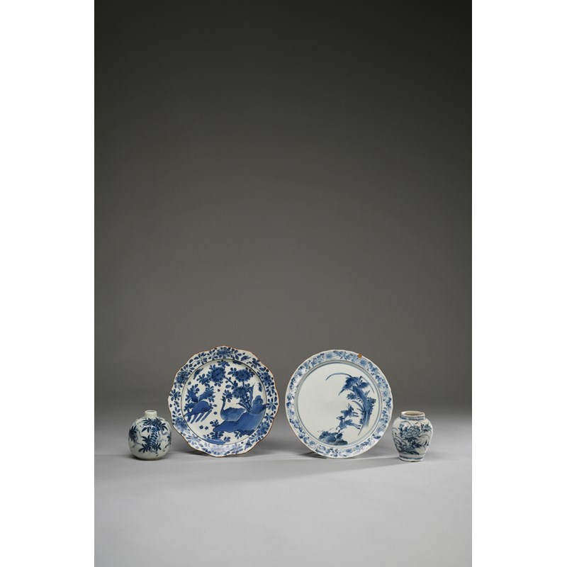 Including: two dishes with foliate rims, one with two deer prancing amongst flowers and rockwork, the other with a goose; together with two jarlets, one octagonal painted with butterflies and peony, the other with wisteria and scrolling tendrils, 21.7cm max. (4)