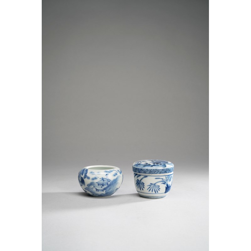 The compressed circular body decorated in underglaze blue with a continuous design of figures in a mountainous landscape, one side with chickens by a rocky outcrop, the other with two thatched buildings amongst luxuriant vegetation; together with a small blue and white circular box and cover, the lid and side painted with palm trees issuing from behind stylised fences, 4.7cm. (3)